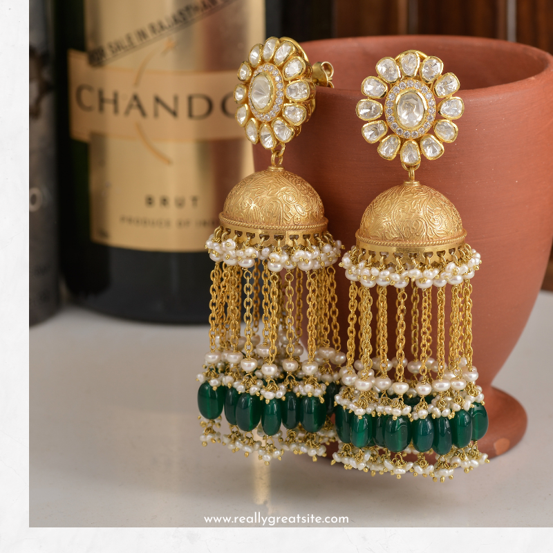Add a festive sparkle to your look with these elegant green and golden jhumka earrings — traditional charm meets timeless beauty. Perfect for weddings and celebrations.